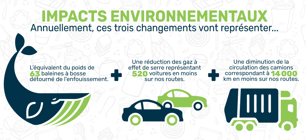 - Près de 2 000 tonnes de matières seront détournées de l’enfouissement, ce qui est l’équivalent du poids de 63 baleines à bosse.