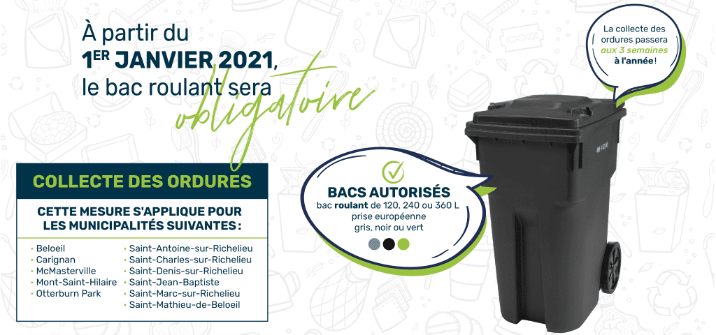 ** Il est important de noter que ces annonces s’adressent aux résidant(e)s des 11 municipalités dont la MRCVR a compétence au niveau de la collecte des matières organiques, des matières recyclables et des matières résiduelles (ordures), soit : Beloeil, Carignan, McMasterville, Mont-Saint-Hilaire, Otterburn Park, Saint-Antoine-sur-Richelieu, Saint-Charles-sur-Richelieu, Saint-Denis-sur-Richelieu, Saint-Jean-Baptiste, Saint-Marc-sur-Richelieu et Saint-Mathieu-de-Beloeil.