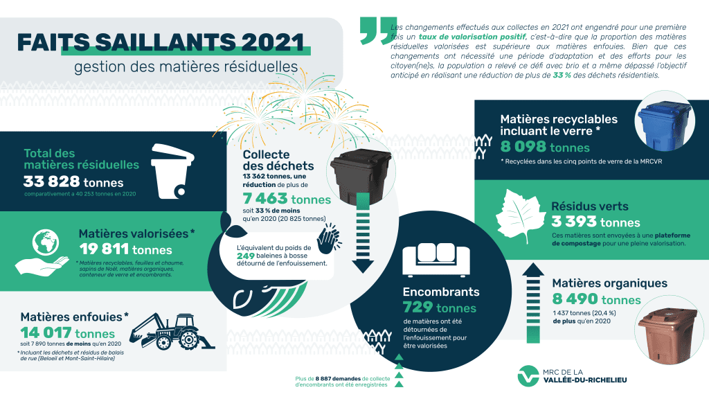 « Les changements apportés aux collectes résidentielles en 2021 ont permis pour une première fois de valoriser davantage de matières résiduelles que celles dirigées à l’enfouissement. Bien que ces changements aient nécessité une période d’adaptation et des efforts pour nous tous et toutes, la population a relevé ce défi avec brio et a même dépassé l’objectif anticipé. », déclarait avec enthousiasme madame Marilyn Nadeau, préfète de la MRCVR et mairesse de la Municipalité de Saint-Jean-Baptiste.