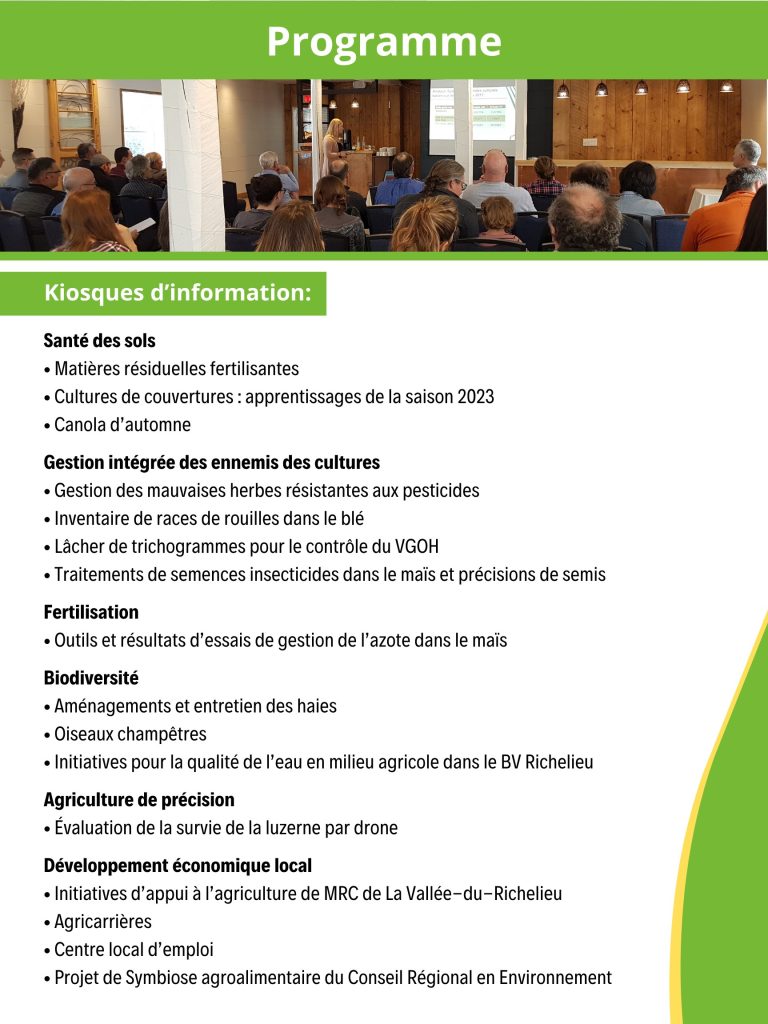 Thèmes : santé des sols, gestion intégrée des ennemis des cultures, fertilisation, biodiversité, agriculture de précision, développement économique local.