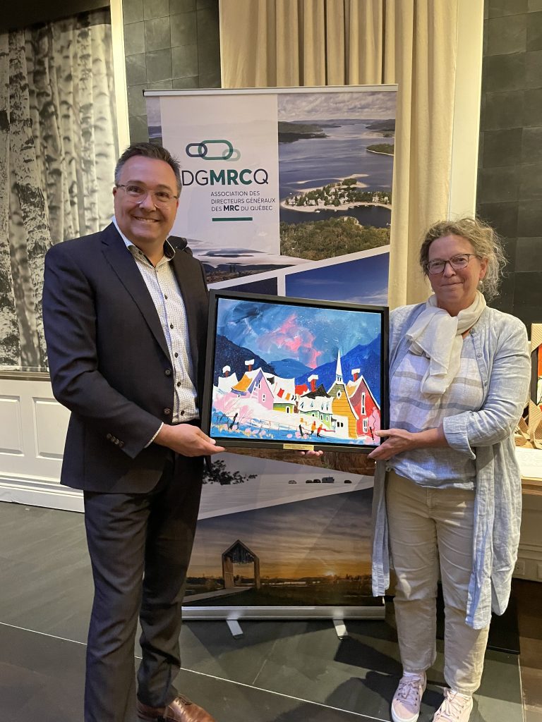 Le prix Hommage a été remis à Evelyne D’Avignon, directrice générale et greffière-trésorière de la MRC de La Vallée-du-Richelieu par Monsieur Sylvain Berthiaume, vice-président de l’Association des directeurs généraux des MRC du Québec (ADGMRCQ) et directeur général de la MRC de Marguerite-D’Youville. Crédit photo : ADGMRCQ