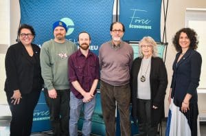 Sur la photo (gauche à droite) : Marilyn Nadeau (préfète de la MRCVR), Yoda Lefebvre (La Grande Trappe), Antoine Turmine, Pierre Cavale, Christiane Litalien et Sabrina Brochu (conseillère en développement culturel, MRCVR). Absente : Julie Labrosse (Les mots s’animent)