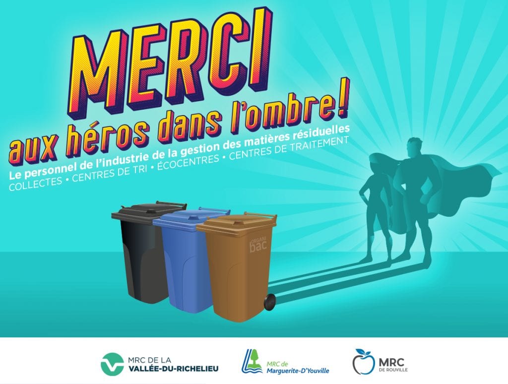 La crise sans précédent dans laquelle sont plongées les collectivités permet de réaliser l’importance du rôle crucial joué par plusieurs d’intervenant(e)s travaillant au front pour le bien commun. Malgré qu’il soit considéré comme un service essentiel, le secteur de la gestion des matières résiduelles (GMR), et son personnel, peuvent passer sous le radar de la reconnaissance populaire. Voilà pourquoi les MRC de La Vallée-du-Richelieu, de Marguerite-D’Youville et de Rouville souhaitent diriger le projecteur sur ces héros œuvrant dans l’ombre et les remercier haut et fort. Grâce à eux, les opérations de collecte, de triage et de traitement des nombreuses matières récoltées hebdomadairement se poursuivent.