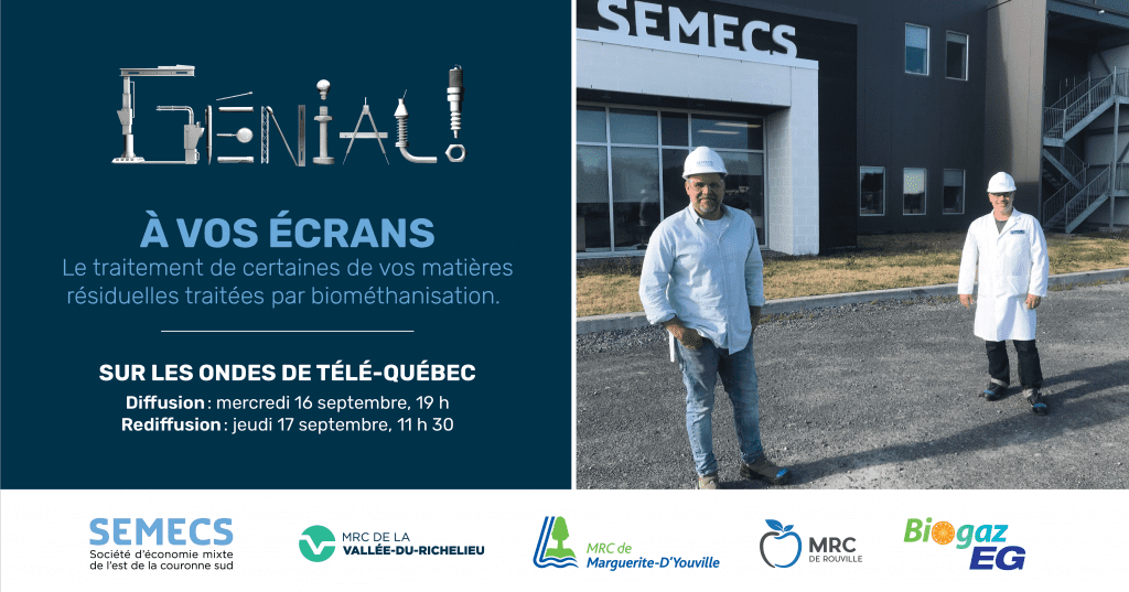 La Société d’Économie Mixte de l’Est de la Couronne Sud (SÉMECS) qui dessert les populations des MRC de la Vallée-du-Richelieu, de Marguerite d’Youville et de Rouville ainsi que de l’agglomération de Longueuil vous invite à syntoniser la chaîne Télé-Québec ce mercredi 16 septembre, à 19 h. Vous en apprendrez davantage sur le rôle et les opérations de son centre de traitement situé à Varennes.