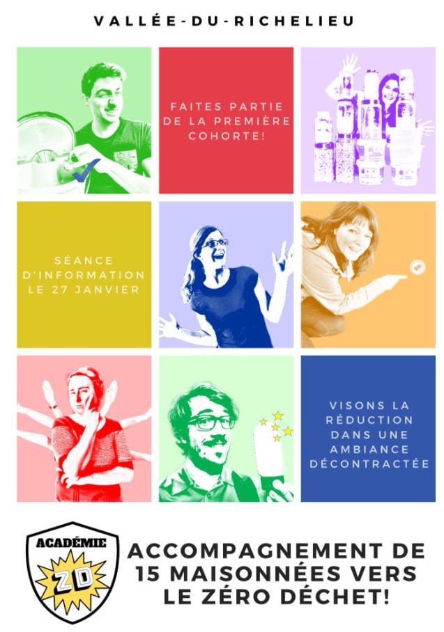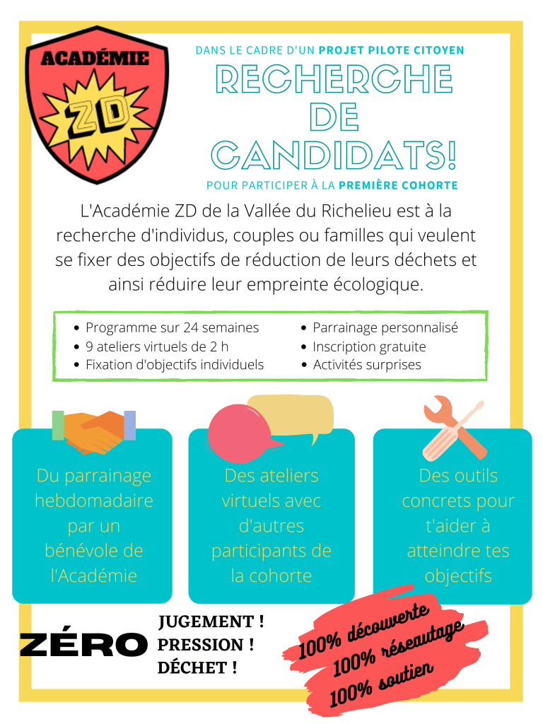 L’Académie ZD de la Vallée-du-Richelieu est un projet-citoyen, membre de l’Association québécoise Zéro Déchet, qui vise à accompagner 15 individus, couples ou familles à réduire leur quantité de matières générées au quotidien pour tendre vers le zéro déchet. Dans une ambiance décontractée et ludique, ce groupe de citoyen(ne)s bénévoles, issus de milieux divers, partageront leurs connaissances et leurs expériences avec les personnes intéressées. L’Académie ZD, c’est une série de rencontres virtuelles qui s’étalera sur une durée de trois mois. Chaque rencontre sera axée sur la discussion et le partage d’expériences.