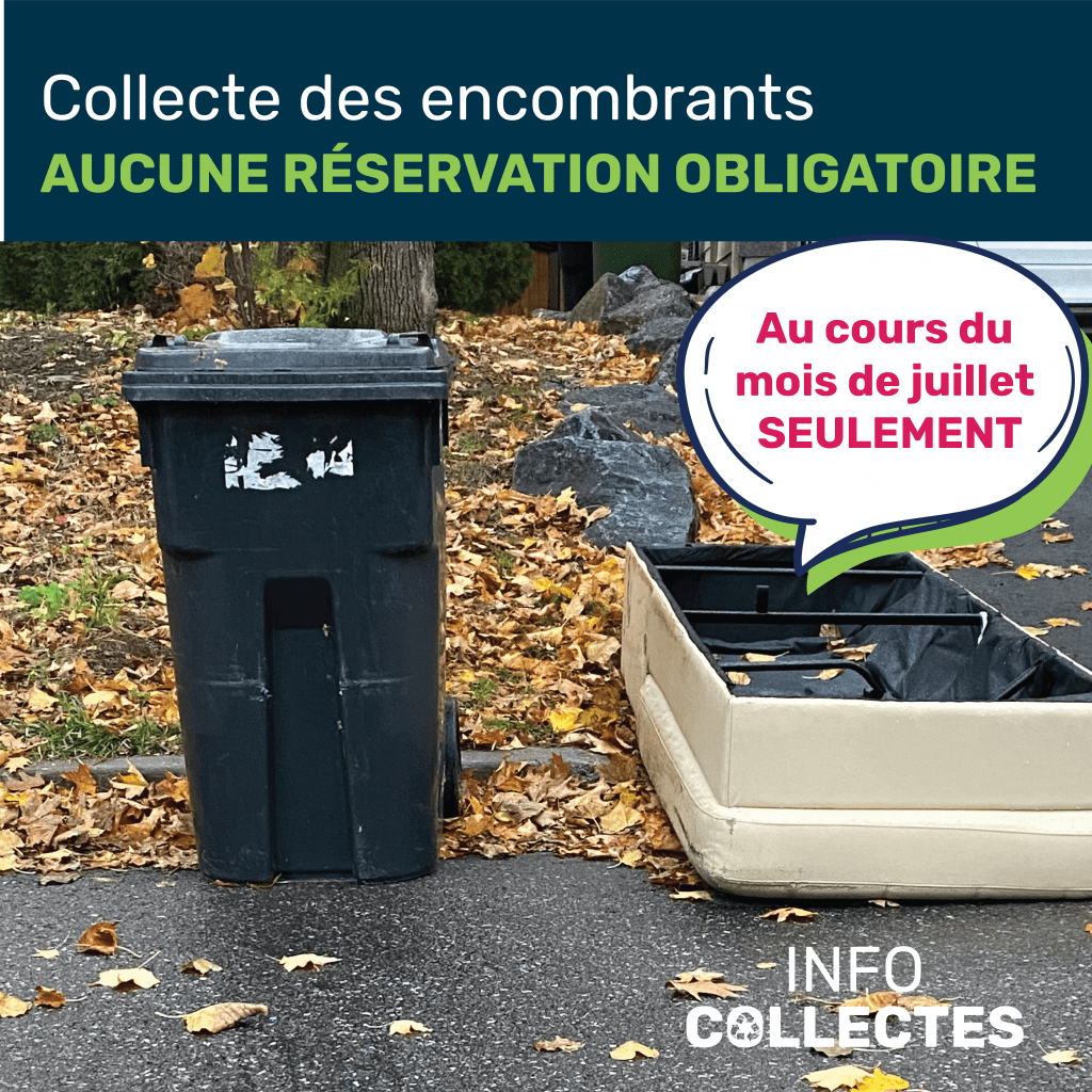 Lors de la journée de collecte des encombrants prévue aux calendriers, le camion de collecte desservira toutes les rues de la municipalité. Les matières acceptées et refusées demeurent les mêmes. Il est important de préciser que les réservations seront obligatoires à partir des collectes du 1er août 2021.