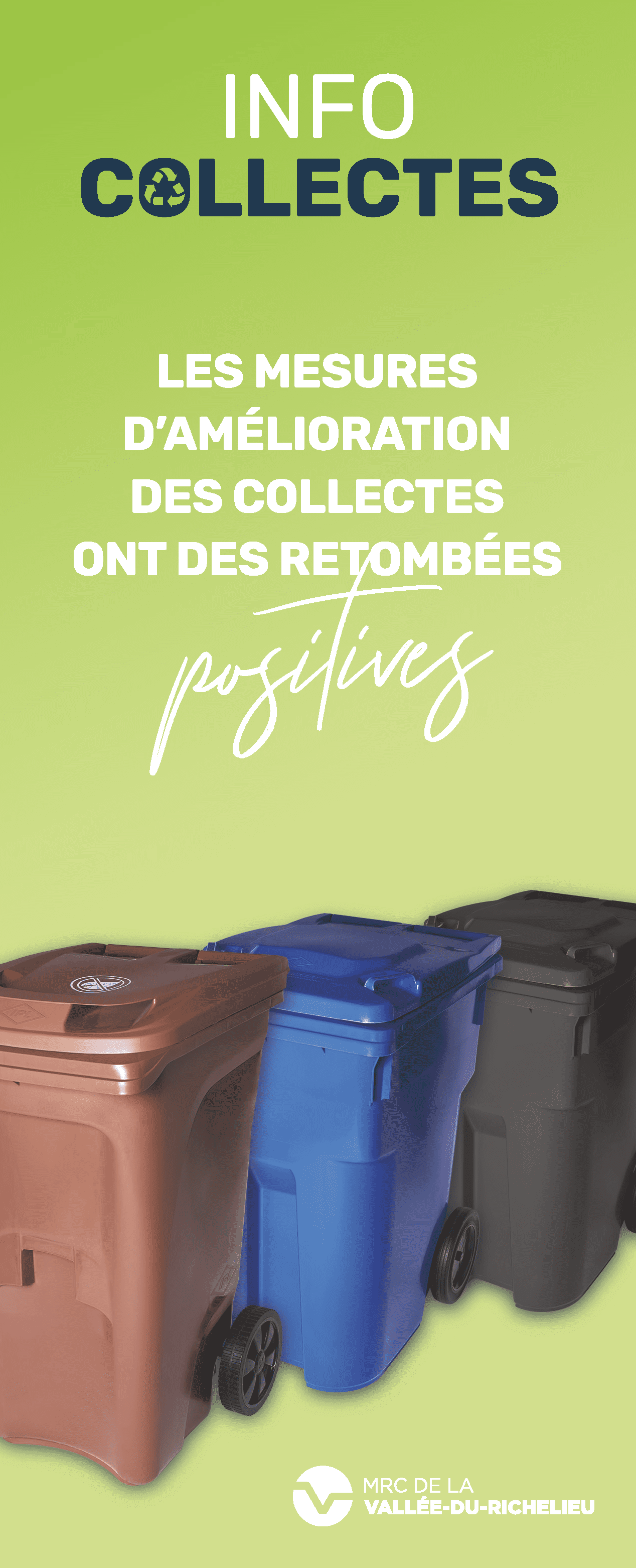 Rappelons que ces nouvelles mesures répondent aux cibles gouvernementales du Plan d’action 2019-2024 de la Politique québécoise de gestion des matières résiduelles du ministère de l’Environnement et de la Lutte contre les changements climatiques (MELCC), dont les objectifs incluent de réduire à 525 kg ou moins la quantité de matières éliminées par habitant et de valorisé plus de 60 % des matières organiques et de 70 % des résidus de construction, de rénovation et de démolition. Elles font également suite aux recommandations de Recyc-Québec, du Plan métropolitain de gestion des matières résiduelles de la Communauté métropolitaine de Montréal (CMM) et du Plan stratégique de la MRCVR. Sachant que collectivement nous atteignons un seuil de saturation, le MELCC cible le bannissement des matières organiques des lieux d’enfouissement. L’application des mesures d’amélioration des collectes de la MRCVR répond à notre devoir de citoyen(ne) pour notre environnement et pour les générations futures.