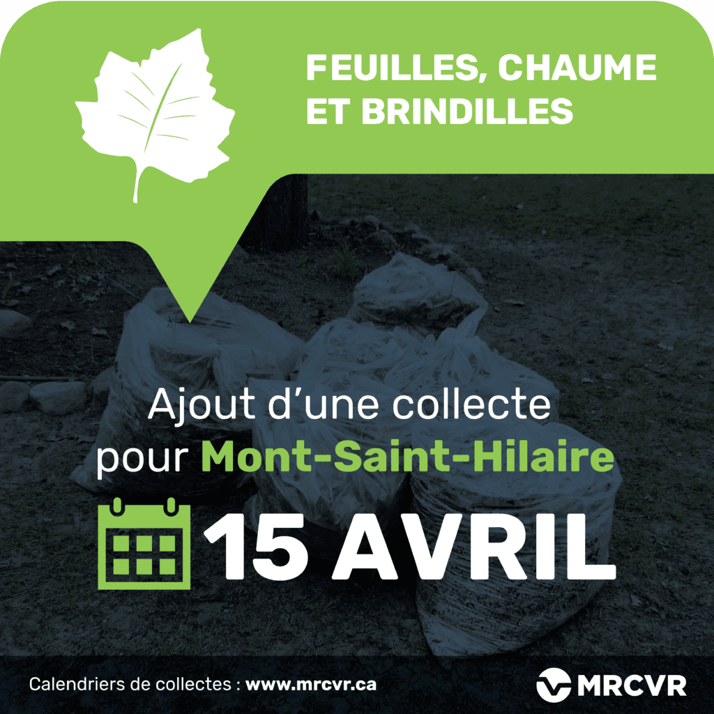 Une collecte de feuilles, chaume et brindilles est ajoutée le mercredi 15 avril prochain pour les citoyen(e)s de la Ville de Mont-Saint-Hilaire. Avec l’arrivée plus hâtive du beau temps, la période de confinement et à la demande de la Ville de Mont-Saint-Hilaire, la MRCVR ajoute cette collecte de feuilles, chaume et brindilles.