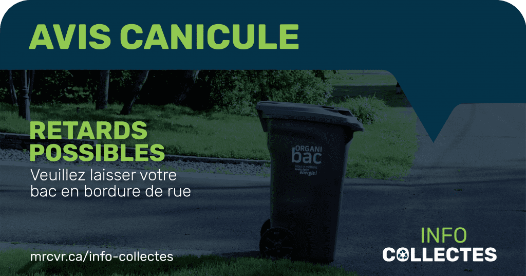 Nous souhaitons aviser les citoyen(ne)s du territoire que de possibles retards sont à prévoir au niveau des collectes des matières résiduelles des prochains jours. Nous demandons aux citoyen(ne)s de laisser les bacs et les contenants en bordure de rue. Ces retards sont causés en raison des impacts cumulés de la chaleur extrême et des mesures de protection du personnel de la collecte liées à la COVID-19.