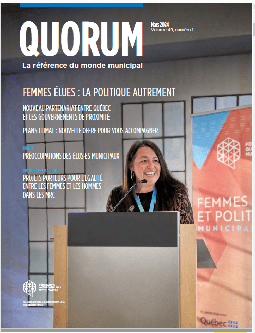 Le magazine QUORUM de la Fédération québécoise des municipalités (FQM) publie en mars, un important dossier sur les préoccupations des élus-es d’aujourd’hui. En entrevue avec Marilyn Nadeau, présidente du Comité femmes et politique municipale de la FQM, mairesse de Saint-Jean-Baptiste et préfète de la MRCVR.
