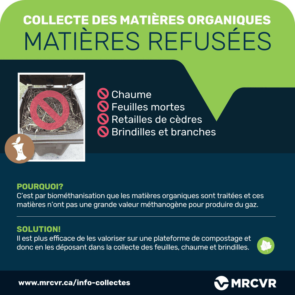 Nous souhaitons rappeler aux citoyen(-ne)s du territoire que certaines matières sont refusées dans votre Organibac, votre bac brun. Le chaume du printemps, les feuilles mortes, les retailles de cèdres, les brindilles et les branches sont des matières interdites dans la collecte des matières organiques.