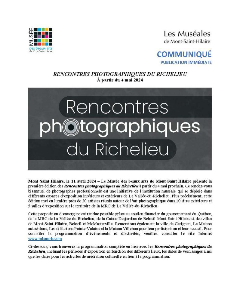 La MRC de La Vallée-du-Richelieu est fière de soutenir financièrement, grâce au Fonds de développement culturel 2024, la première édition des Rencontres photographiques du Richelieu, présentée par le Musée des beaux-arts de Mont-Saint-Hilaire (MBAMSH) à partir du 4 mai.