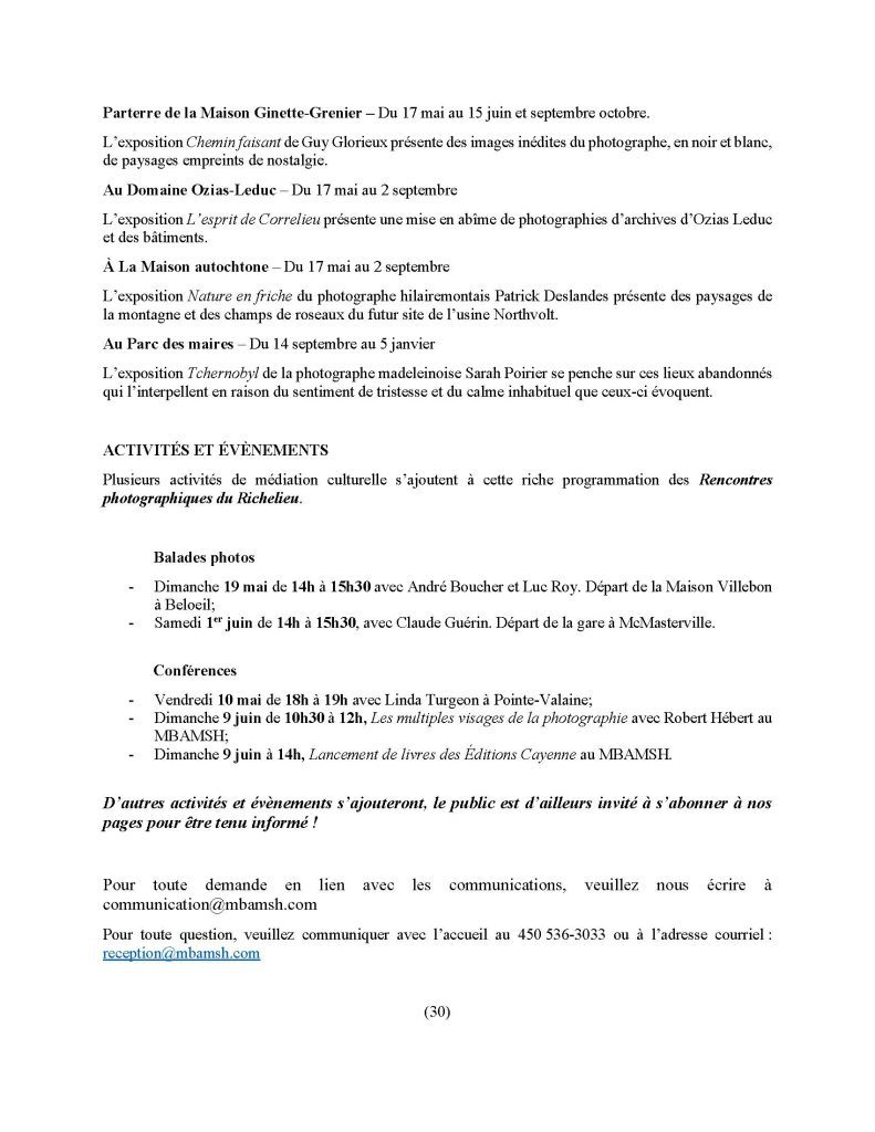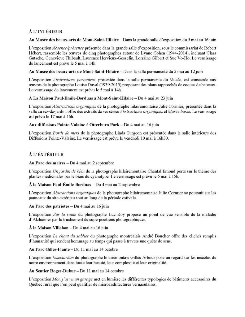 Ce rendez-vous bisannuel de photographes professionnels est une initiative de l’institution muséale qui se déploie dans différents espaces d’exposition intérieurs et extérieurs dans la vallée du Richelieu. Le talent de près de 20 artistes réunis autour de l’art photographique, sera mis en lumière dans 10 sites extérieurs et 5 salles d’exposition sur le territoire de la MRCVR.