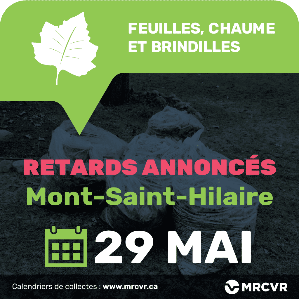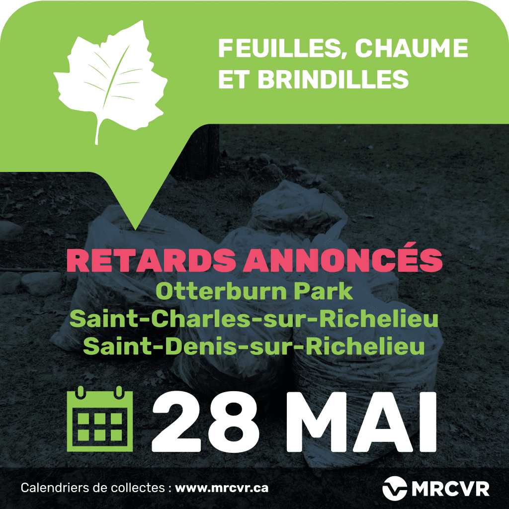 En raison des impacts cumulés de la chaleur extrême et des mesures de protection liées à la COVID-19, nous vous informons que des retards sont à prévoir pour les collectes prévues ce jeudi 28 mai et vendredi 29 mai de feuilles, chaume et brindilles, et ce, pour les municipalités d’Otterburn Park, de Saint-Charles-sur-le-Richelieu, de Saint-Denis-sur-le-Richelieu et de Mont-Saint-Hilaire.