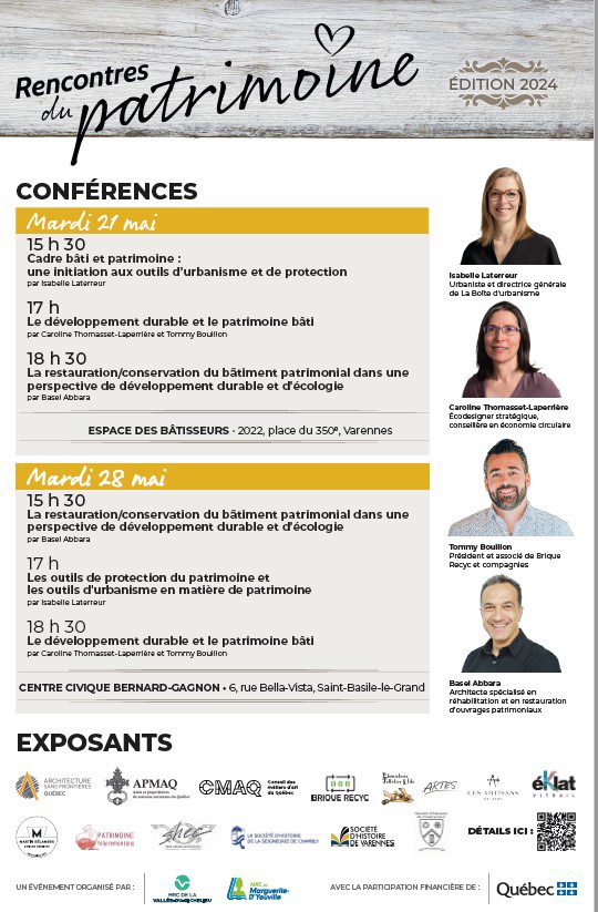 La MRC de La Vallée-du-Richelieu (MRCVR) et la MRC de Marguerite-D’Youville (MRCMDY) sont fières d’annoncer conjointement la tenue de la deuxième édition de l’événement Les Rencontres du Patrimoine au mois de mai. Ce rendez-vous sur le patrimoine bâti a vu le jour à l’automne 2023 et a su répondre aux interrogations de la population des municipalités des deux territoires, à travers un volet de kiosques de métiers artisanaux et traditionnels en continu et un volet de conférences. Cette deuxième édition, présentée gratuitement, est axée sur l’intérêt environnemental de la restauration patrimoniale. De nouveaux sujets sont abordés pendant les trois conférences et une quinzaine de kiosques sont animés par des expert(e)s du patrimoine bâti.